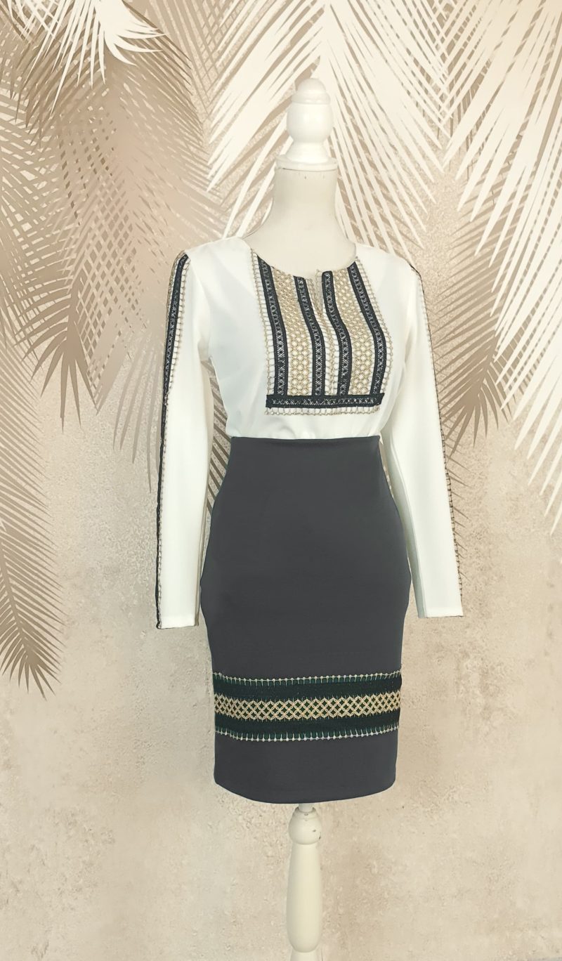 Fusta neagră cu broderie este elementul central al compleului, conferind eleganță și originalitate. Croiala atent realizată urmează linia corpului, subliniind talia și oferind un aspect feminin și echilibrat. Broderia fină de pe fustă creează un contrast subtil cu albul bluzei, oferind profunzime și rafinament întregii ținute. Materialul de calitate asigură o mișcare lejeră și un confort deosebit, iar nuanța neagră clasică face ca fusta să fie ușor de integrat în diverse combinații și stiluri.