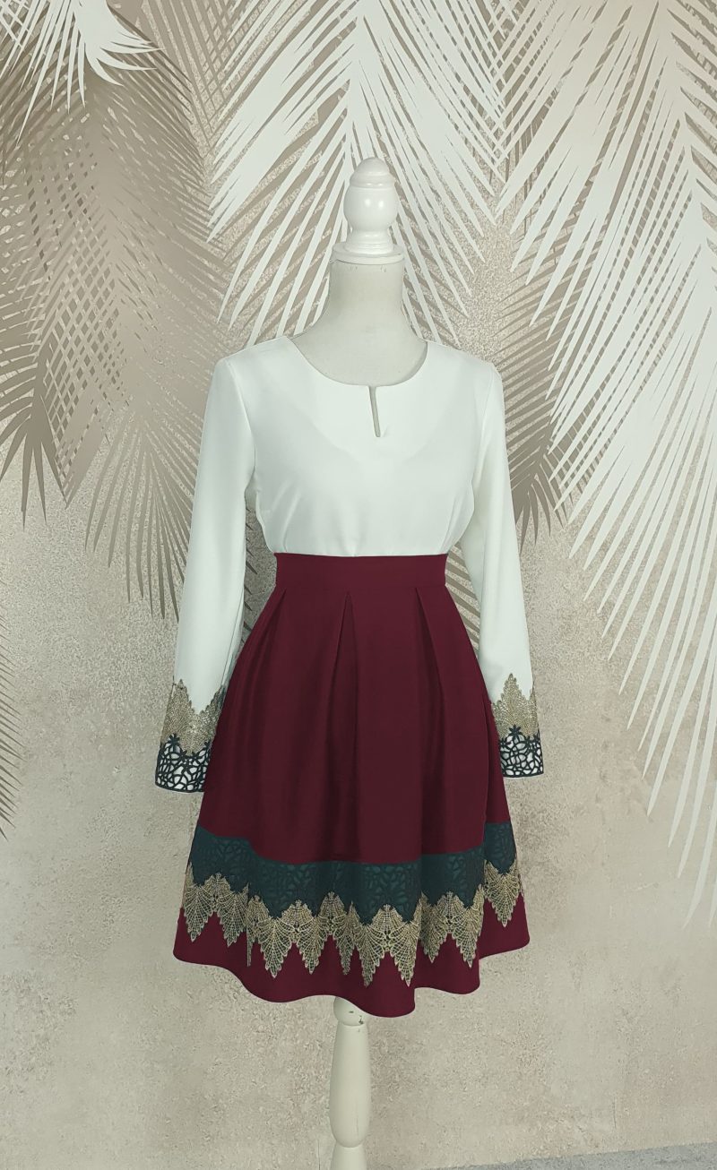 Aceasta fustă se potrivește perfect atât pentru o zi de muncă, cât și pentru o ieșire la un eveniment special. Pliurile sale conferă volum și mișcare, iar broderia adaugă un accent de originalitate, transformându-l într-o piesă vestimentară deosebită, care nu va trece neobservată. Oferă-ți luxul unei ținute elegante și alege fusta în pliuri visinie cu broderie Carina – o piesă unică, care îți va pune în evidență feminitatea și stilul personal.