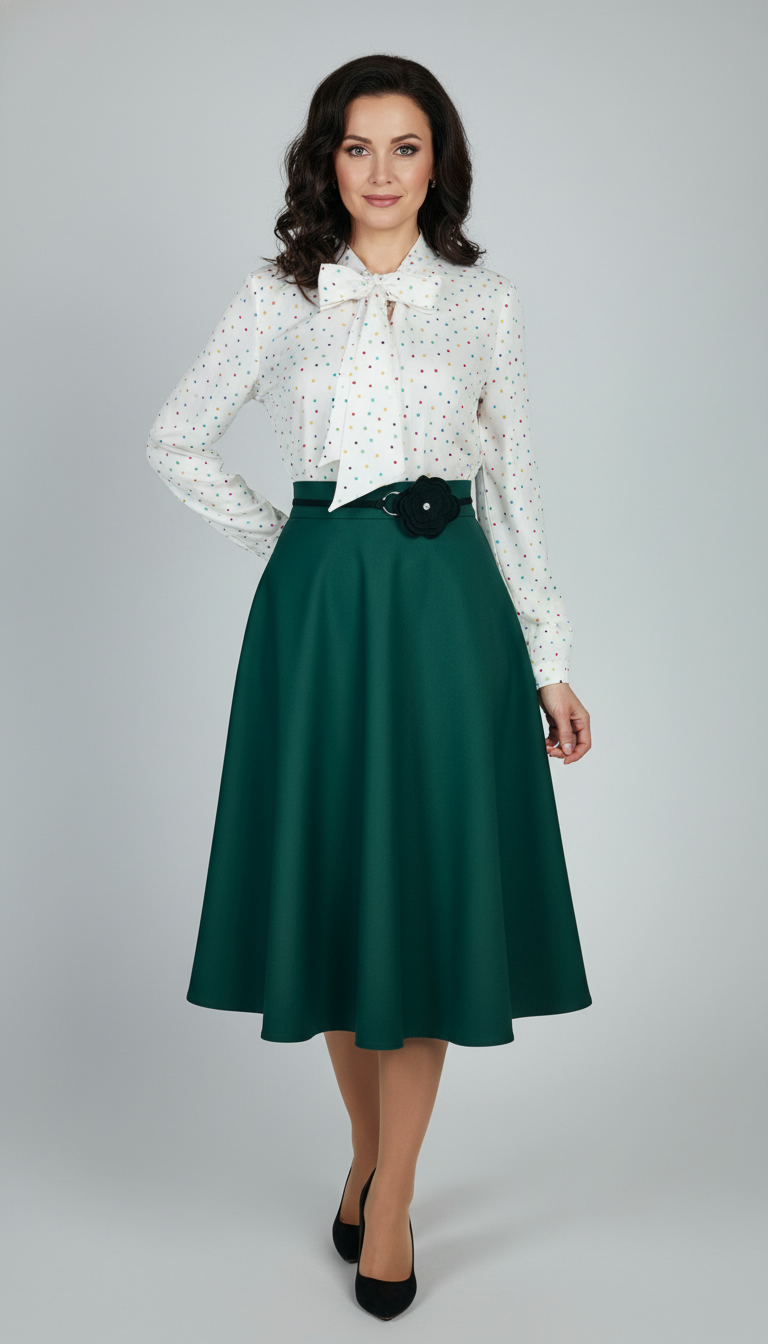 Bluza alba cu esarfa cu buline o piesă vestimentară aduce o notă jucausă și vibrantă în garderoba ta, îmbinând albul cu motivele vesel colorate de buline.