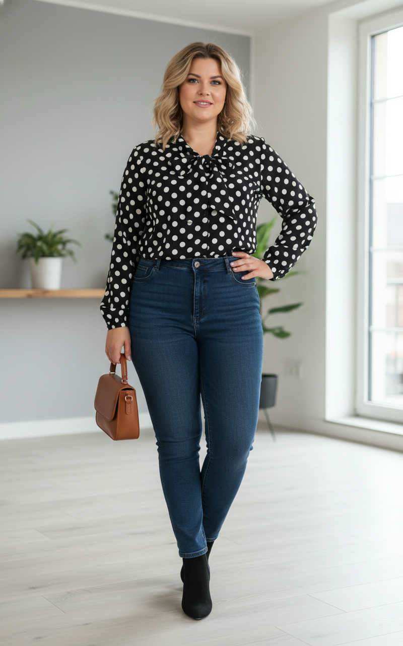 Bluză neagră cu buline albe, o piesă clasică și versatilă, perfectă pentru ținute elegante sau casual.