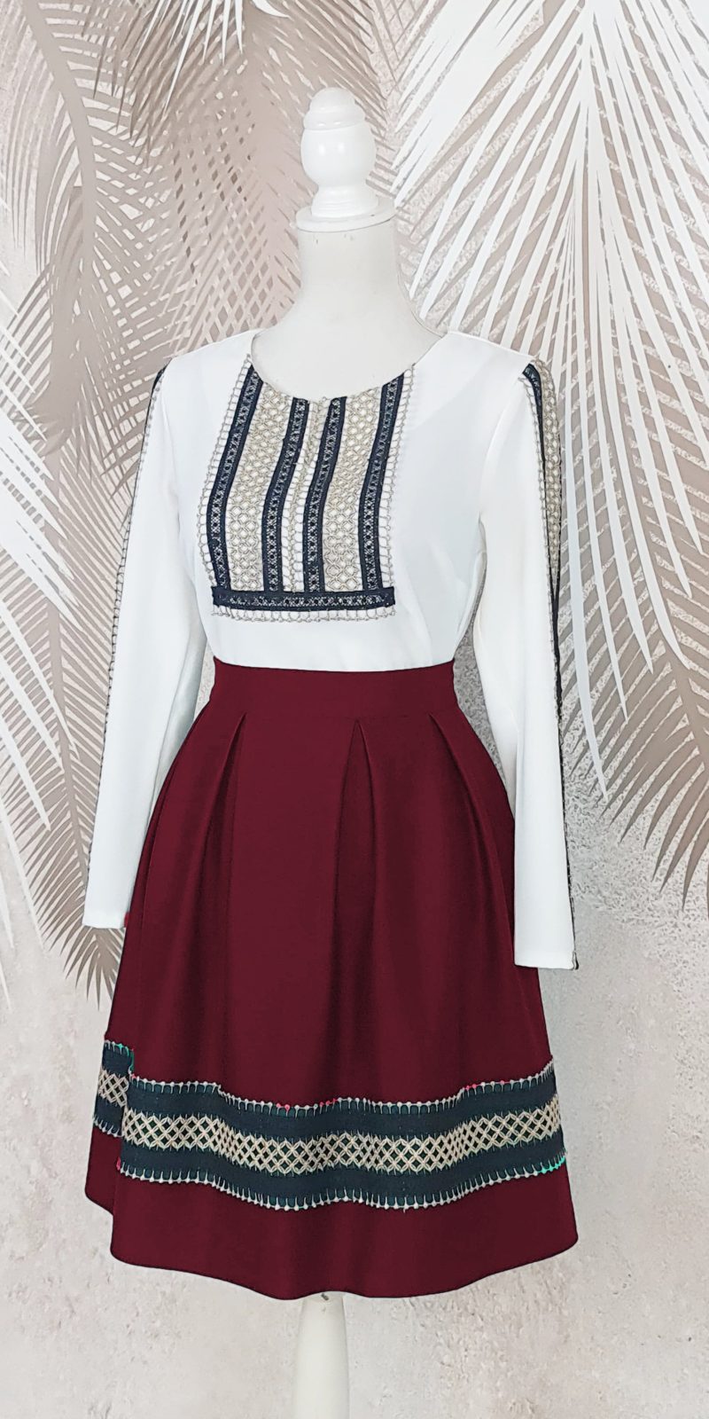 Bluza albă stilizată este piesa centrală a acestui set, realizată dintr-un material fin, plăcut la atingere, care conferă lejeritate și un aer sofisticat. Croiala sa ușor amplă avantajează silueta, iar detaliile stilizate – fie ele manșetele cu nasturi perlați, gulerul discret rotunjit sau inserțiile delicate din dantelă fină – transformă bluza într-o piesă vestimentară deosebită. Albul imaculat oferă un contrast plăcut și luminos, punând în valoare atât tenul cât și broderia fustei.