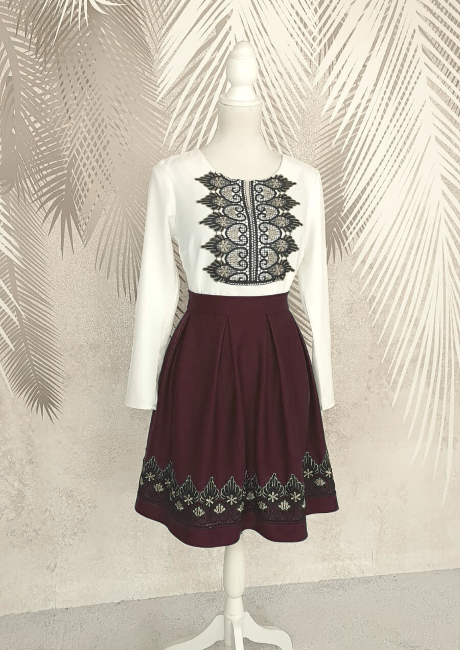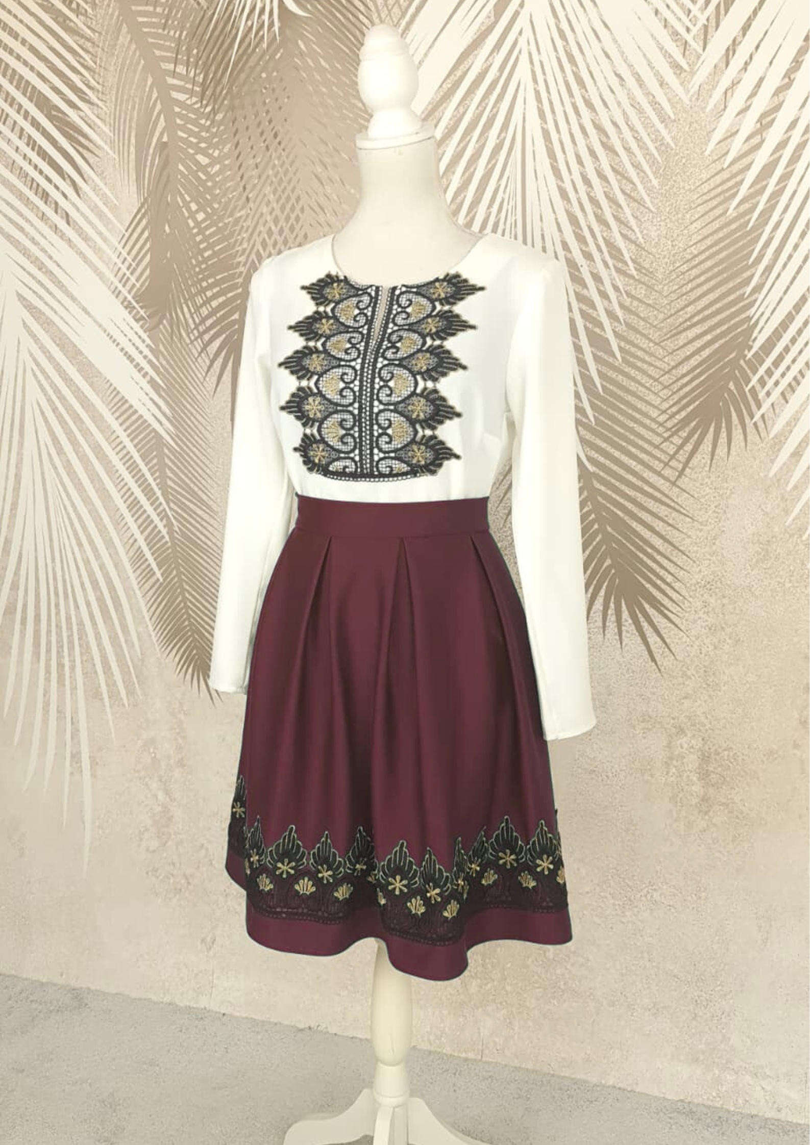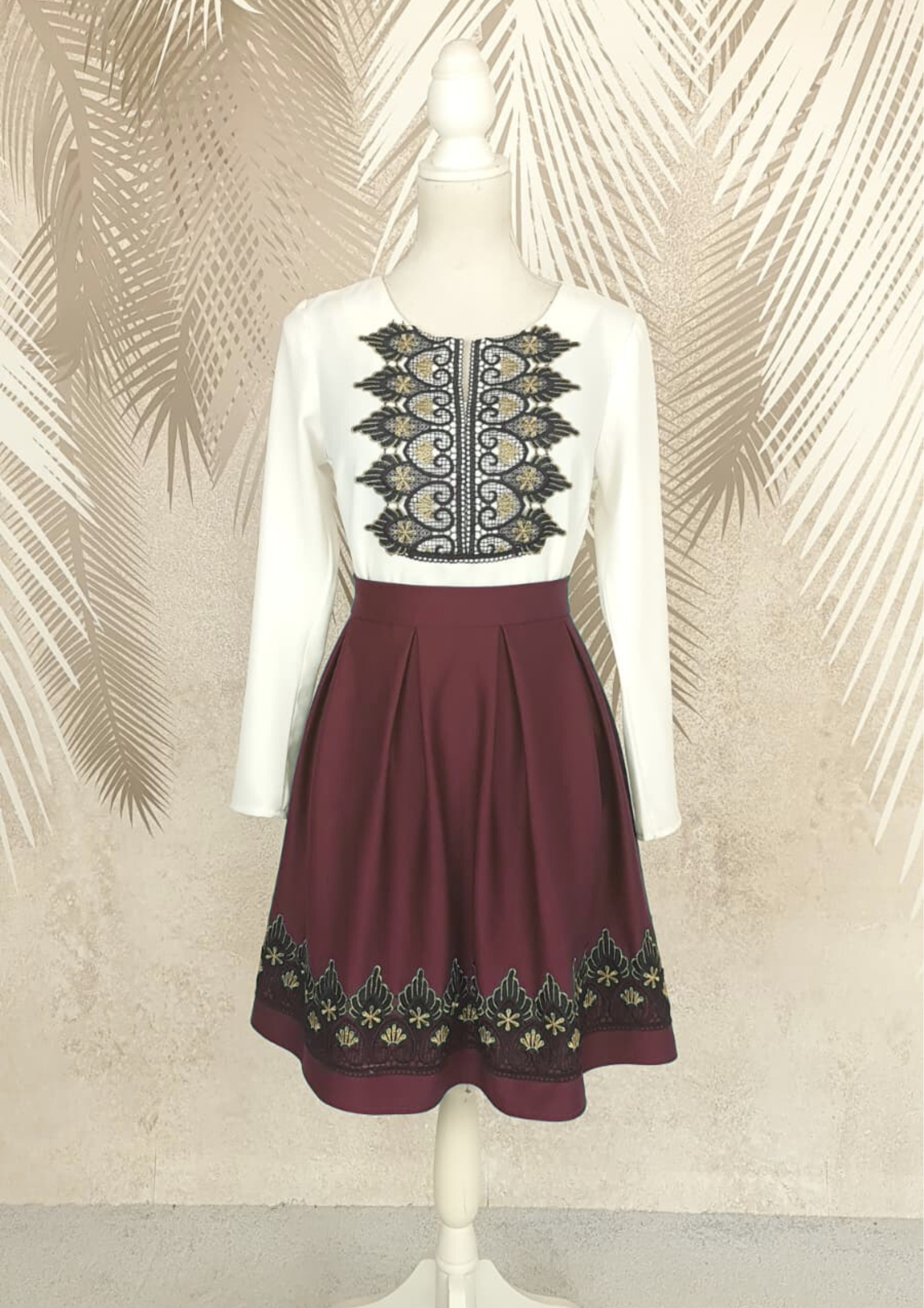 Compleu bluza albă și fustă vișinie în pliuri cu broderie – feminitate și eleganță modernă