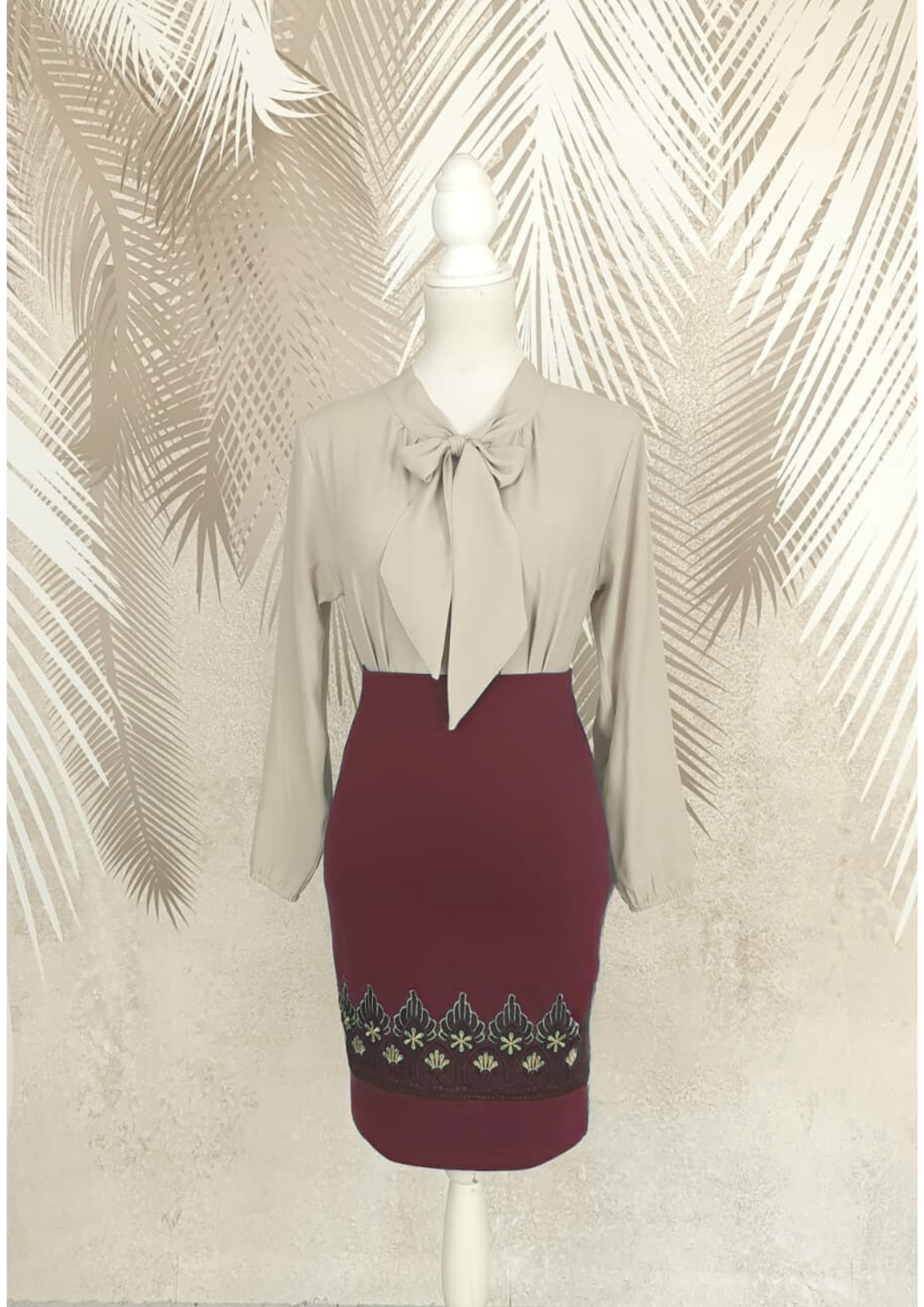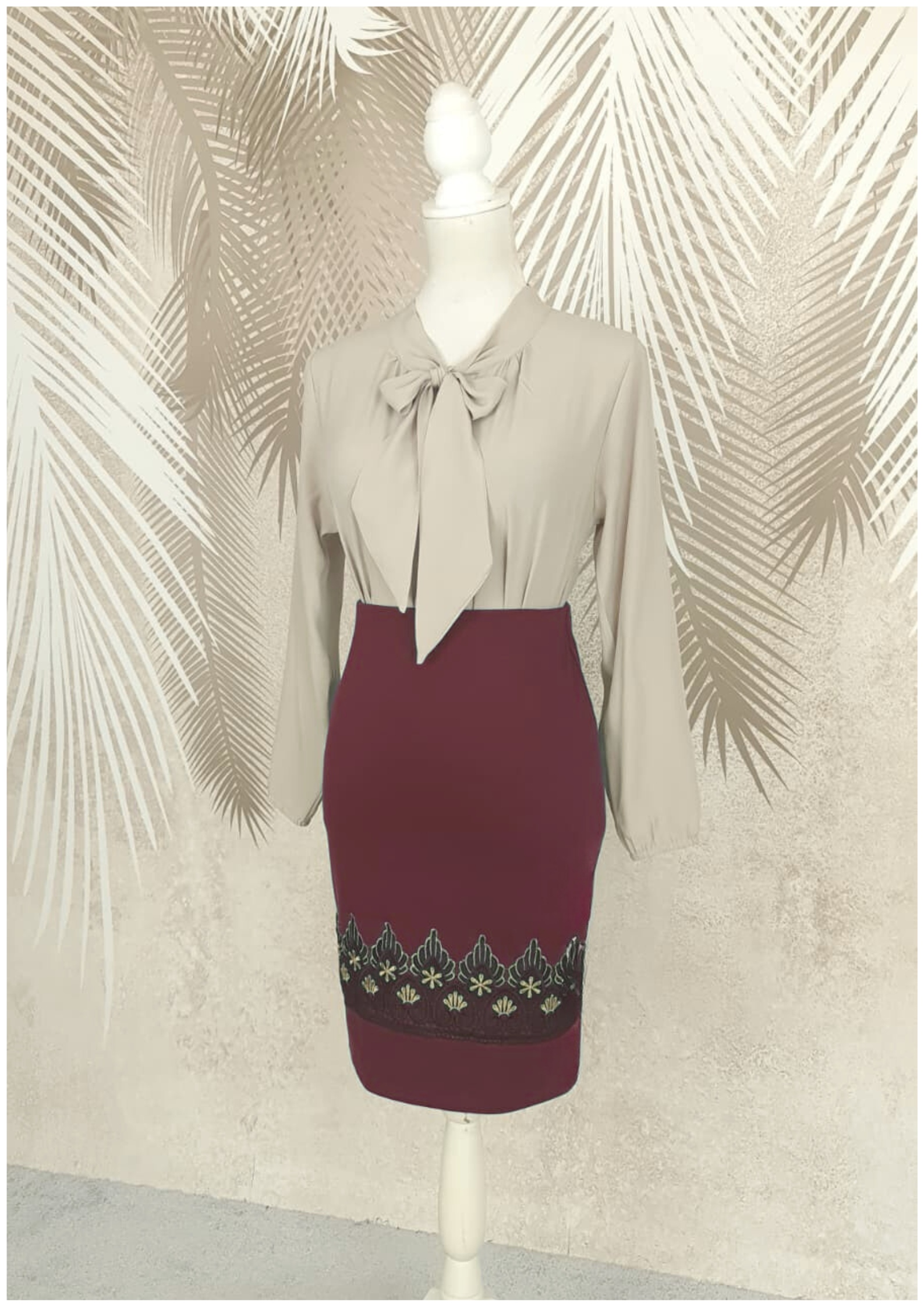 Eleganță modernă și rafinament într-un ansamblu sofisticat: bluza bej stilizată și fusta conică vișiniu cu broderie, confortabile și versatile, perfecte pentru femeia modernă care apreciază feminitatea și stilul impecabil.