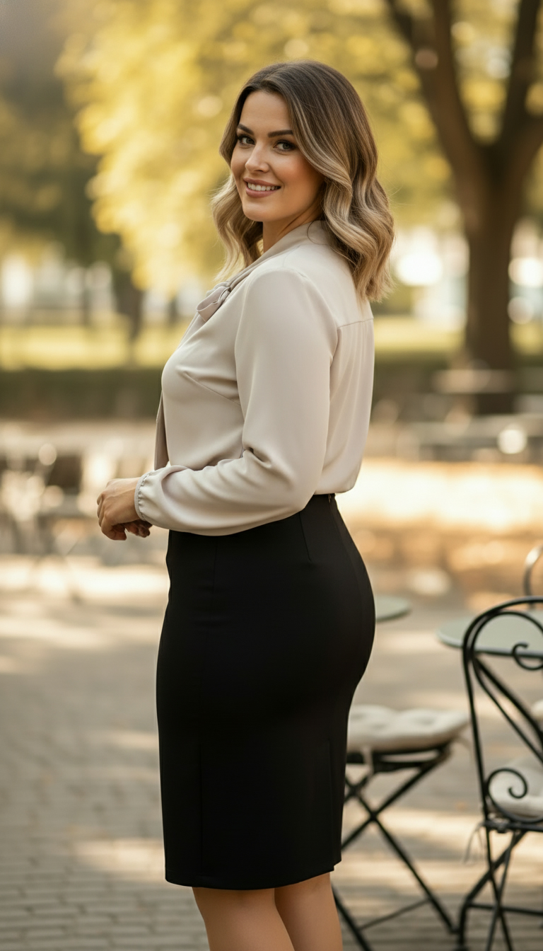 Împreună, bluza bej și fusta neagră conică alcătuiesc un compleu echilibrat, elegant și feminin. Este ținuta care transmite profesionalism la birou, dar în același timp îți oferă un look chic și modern la o ieșire în oraș sau la un eveniment semi-formal.