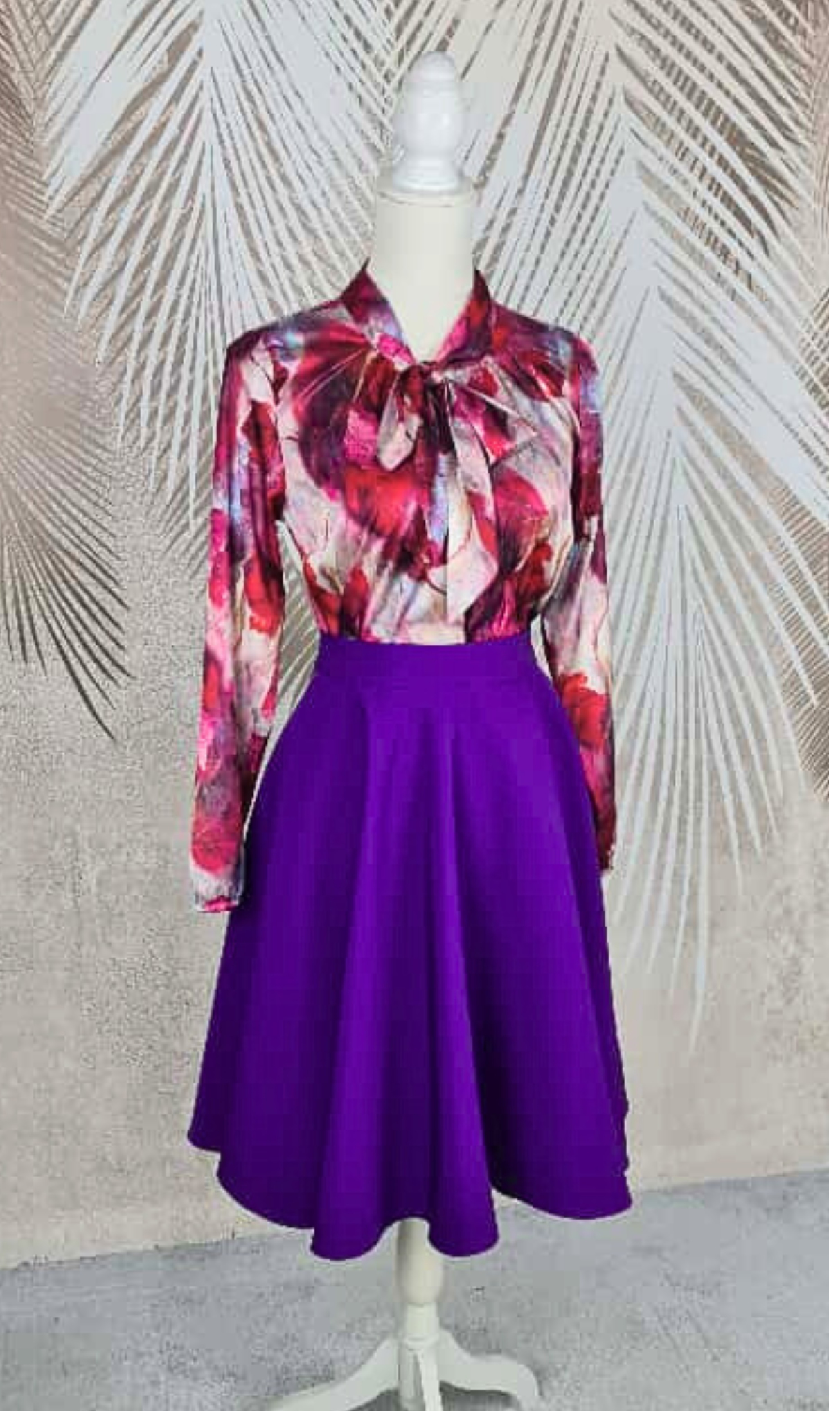 Fusta clos mov completează perfect bluza Smaranda, oferind un contrast elegant și un look chic. Croiala clos a fustei este concepută pentru a alungi silueta și a oferi un aer feminin și jucăuș. Materialul de calitate superioară asigură o cădere frumoasă și un confort sporit, fiind ideală pentru purtarea pe parcursul întregii zile. Fusta mov este extrem de versatilă, putând fi asortată cu diverse topuri, de la bluze elegante la tricouri casual, făcându-se astfel potrivită pentru orice ocazie.