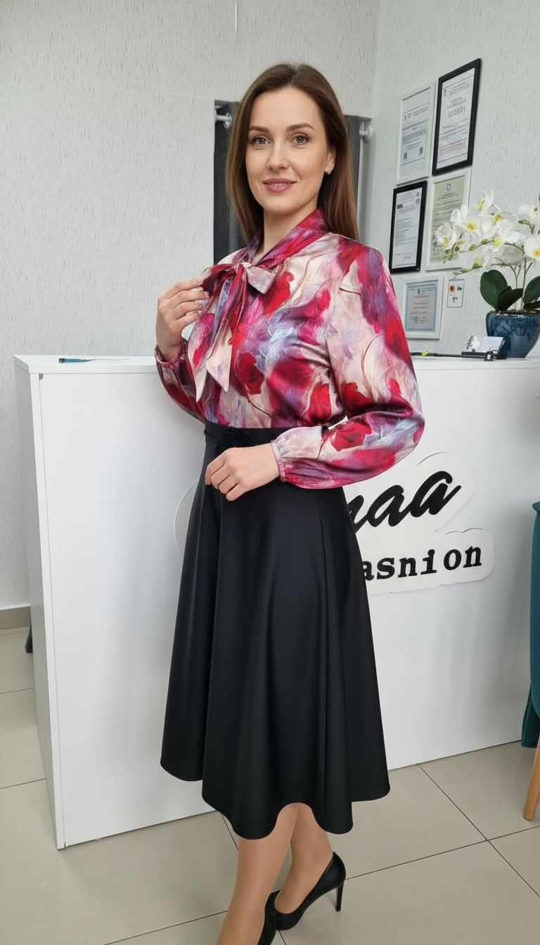 Bluza Smaranda combinată cu fusta neagră în clos creează un compleu rafinat și versatil, perfect pentru birou sau evenimente speciale. Croiala impecabilă și materialele fine oferă confort și feminitate fiecărui pas.