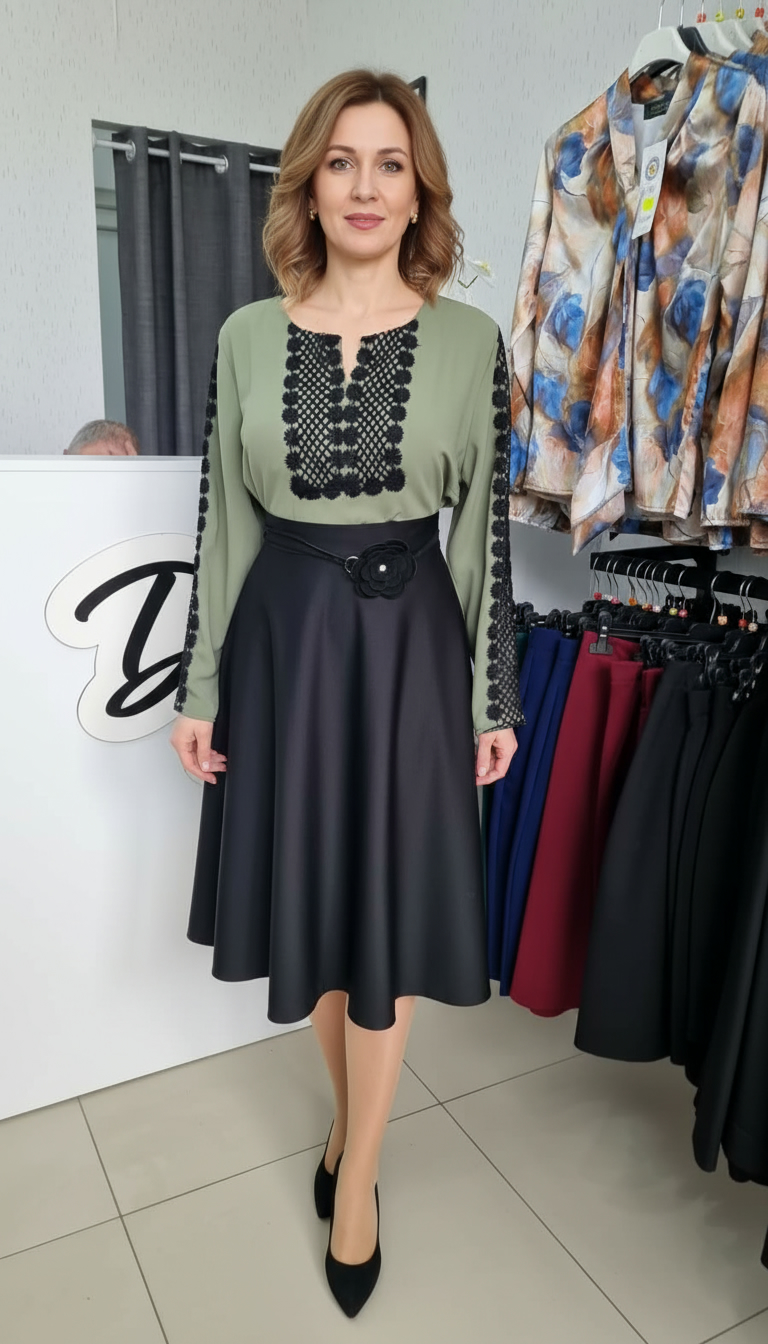 Un alt avantaj major al acestui compleu damă kaki și negru este versatilitatea: piesele pot fi purtate și separat, creând multiple combinații vestimentare. Bluza kaki poate fi asortată cu pantaloni eleganți sau jeans, iar fusta cloș neagră poate fi combinată cu cămăși, topuri sau alte bluze elegante din garderoba ta.