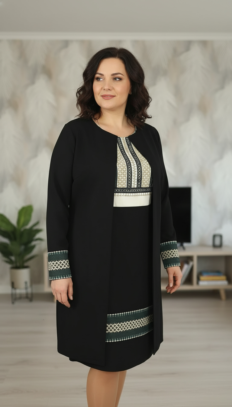 Compleul Ilinca, format din cardigan elegant, bluză albă și fustă neagră cu broderie, este alegerea perfectă pentru femeile care își doresc o ținută completă, rafinată și versatilă. Acest compleu dama elegant îmbină armonios trei piese esențiale, creând un look sofisticat, potrivit atât pentru mediul office, cât și pentru evenimente speciale sau ocazii în care eleganța este esențială.