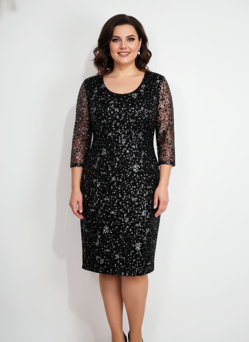 Rochie de ocazie conica din tulle cu gliter, are maneci trei sferturi, cu un croi conic si se inchide cu fermoar la spate. O rochie de ocazie potrivite pentru cununie civila, botez, nunti si alte evenimente, cat si pentru o rochie de nasa sau soacra.