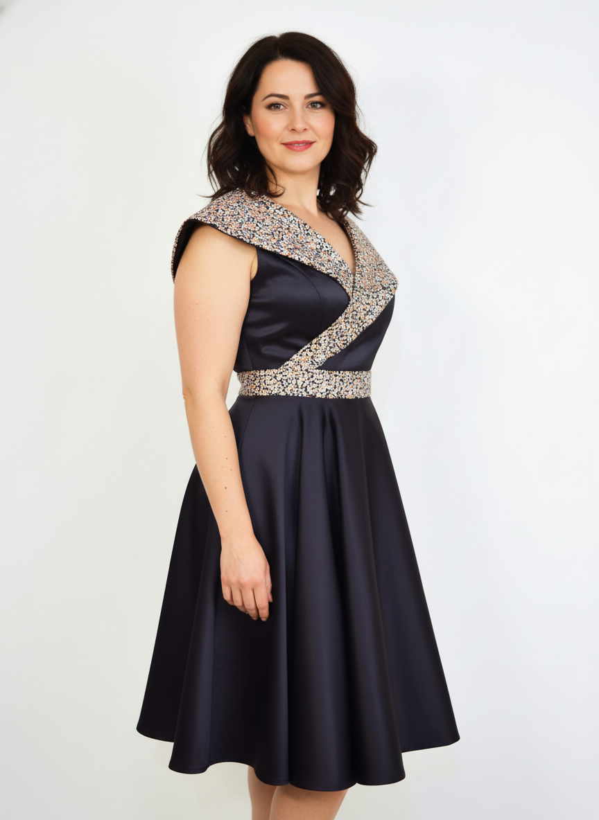 Rochie de ocazie din tafta neagra si broderie tulle cu gliter , avand un croi deosebit si unicat. Potrivita pentru toate doamnele care vor deveni soacra sau nasa sau pentru femeile care vor participa la un eveniment, o gala, un botez sau nunta.