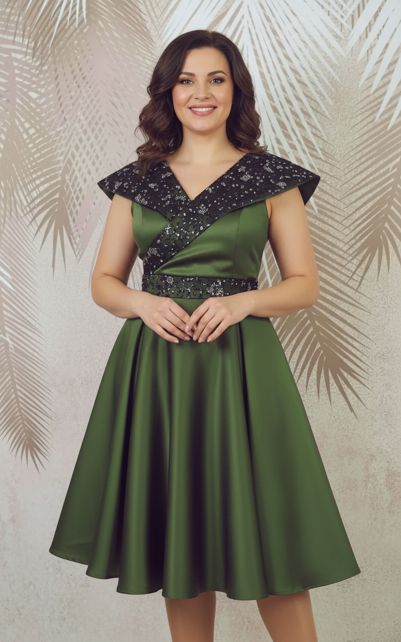 Potrivită pentru diverse evenimente, de la nunți și botezuri până la recepții și petreceri de gală, rochia de ocazie din tafta kaki și broderie din catifea este ideală pentru femeile care doresc să se facă remarcate într-un mod subtil și elegant. Cu un croi impecabil, rochia avantajează orice siluetă, evidențiind frumusețea naturală a purtătoarei.