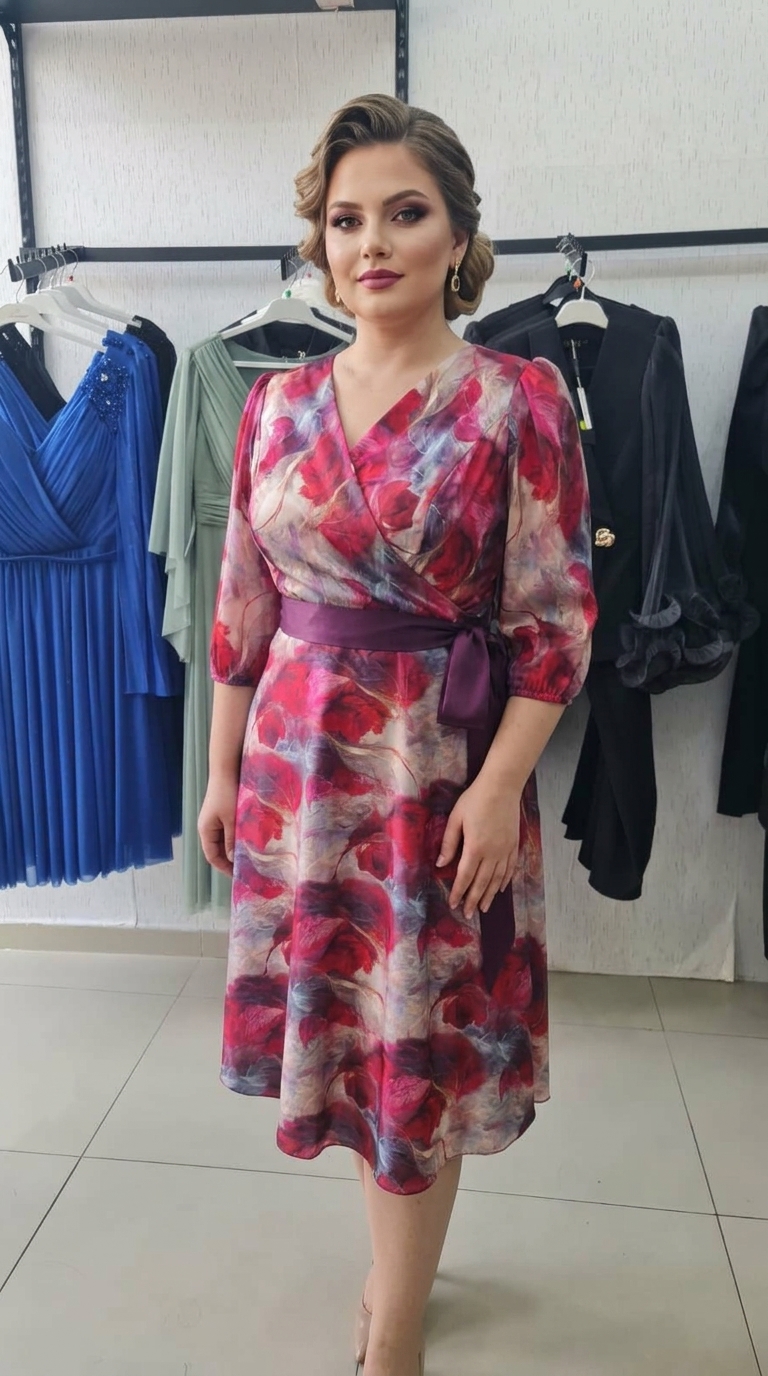 Mânecile trei sferturi adaugă un plus de eleganță și versatilitate, făcând această rochie potrivită pentru orice sezon. Materialul este ușor, fin și plăcut la atingere, asigurând confort pe durata întregii zile. Imprimeul floral bogat transformă această rochie într-o piesă statement, perfectă pentru a atrage toate privirile.