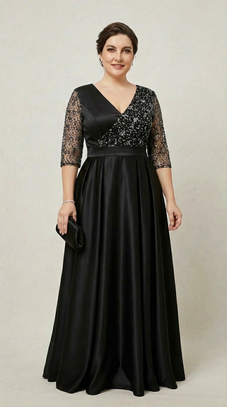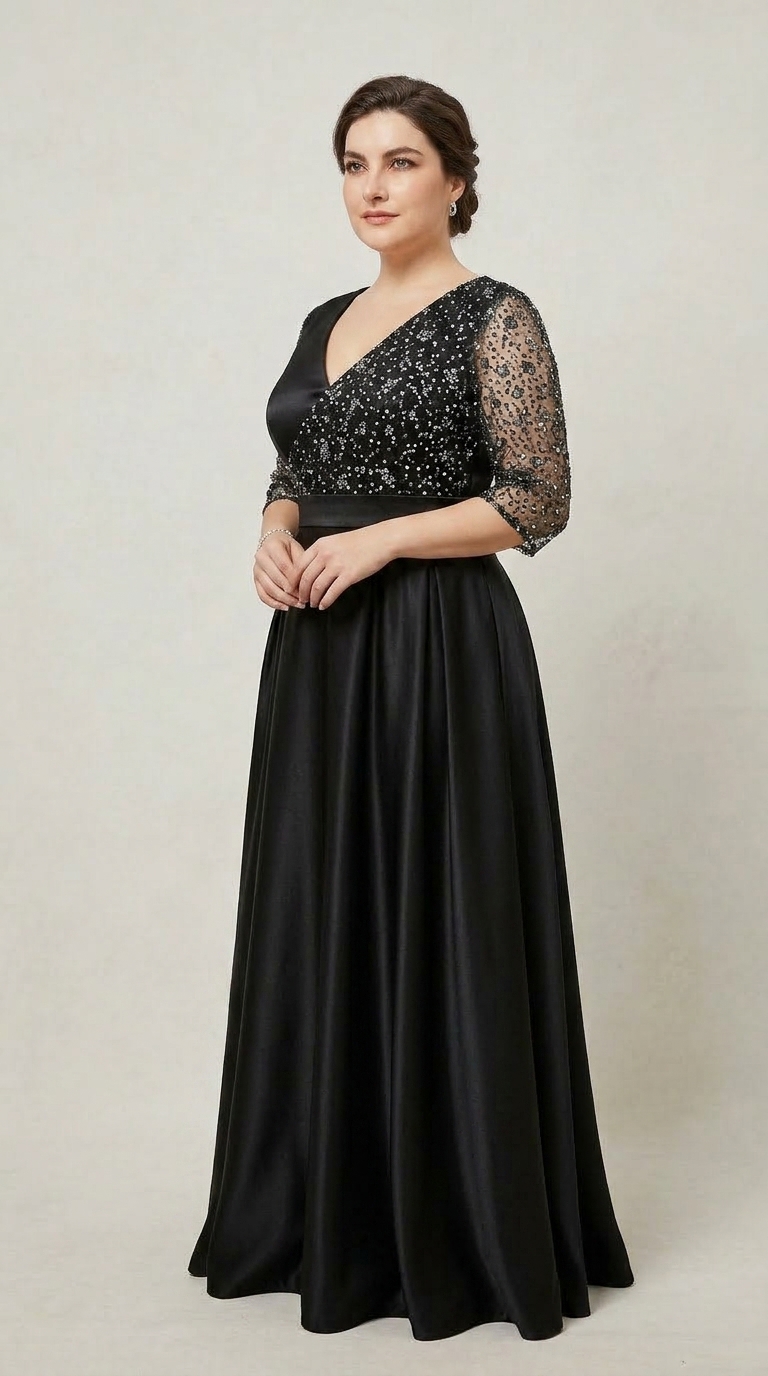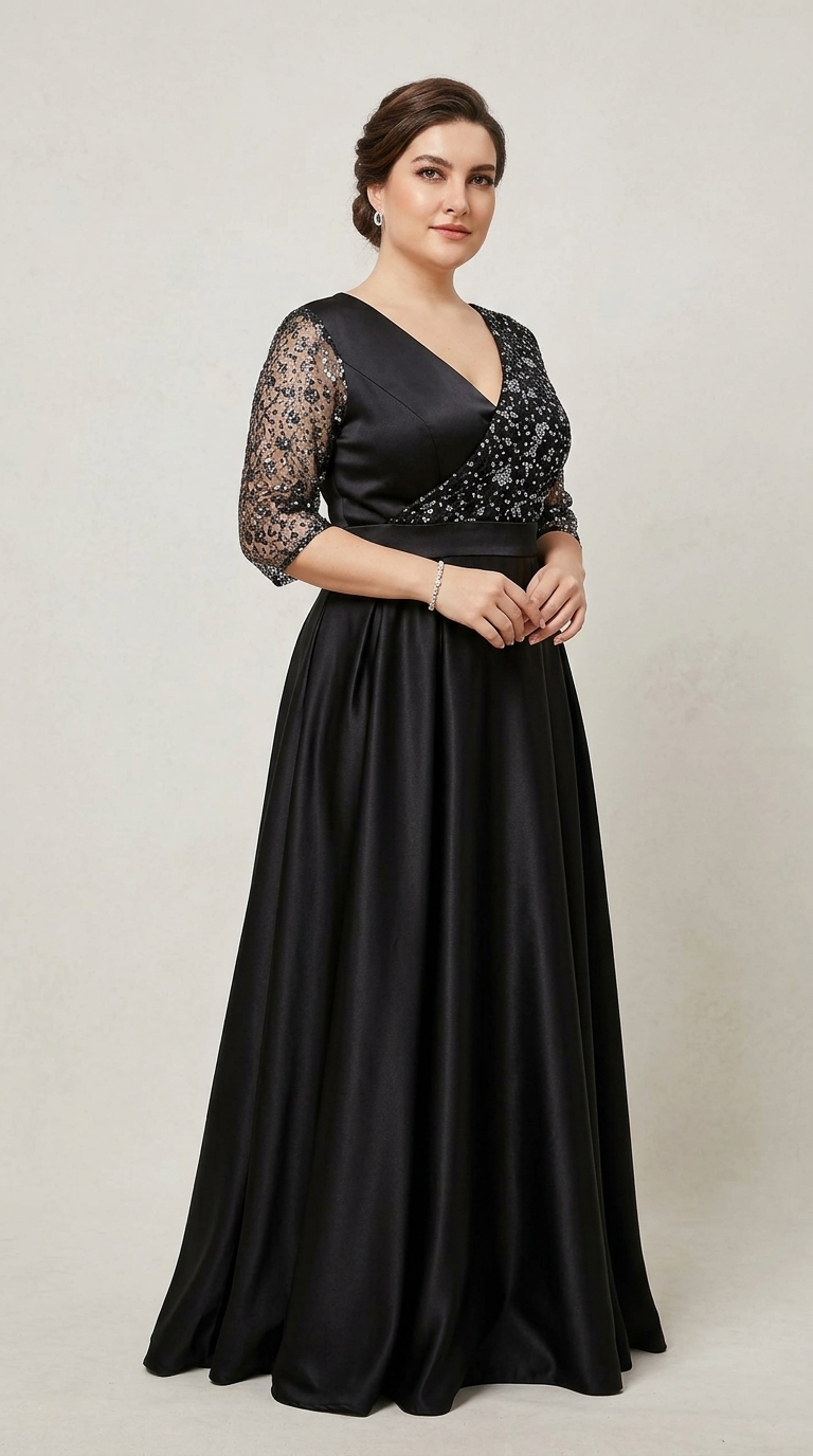 Rochie lunga de ocazie de culoare neagra din tafta si broderie din tulle cu gliter gri, are un bust deosebit cu un croi parte peste parte. Deosebita ca o rochie de nasa sau de soacra, rochie pentru evenimente.